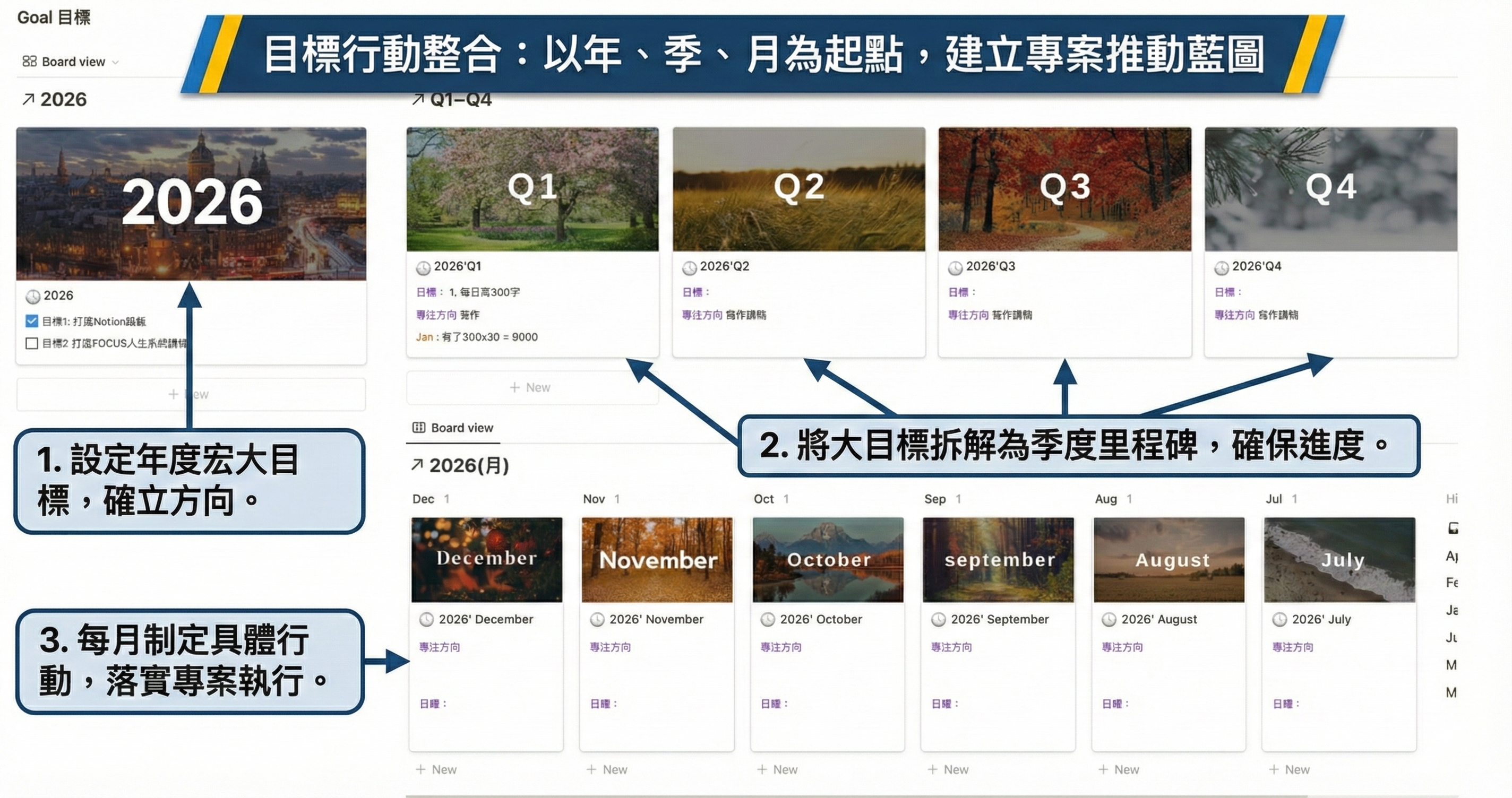 目標行動整合:以年,季,月目標為起點,一步一步建立起想要推動的專案內容